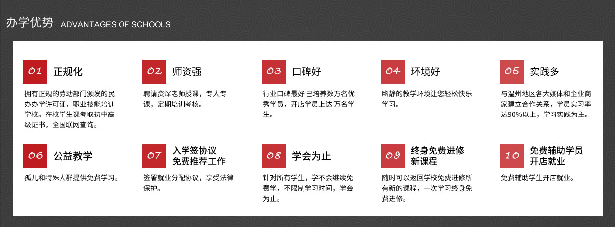我校以培養(yǎng)實用型專業(yè)人才為目標(biāo),理論學(xué)習(xí)、操作訓(xùn)練與專業(yè)實踐三位一體,實行一對一的教學(xué)模式,常年招生,男女不限。畢業(yè)后推薦工作、 主要是以理論為輔實操為主的教學(xué)模式授課。老師手把手教、一對一輔導(dǎo),為學(xué)員量身定做課程,保證學(xué)會為止、 中途不收取任何費用,(無任何隱形消費)進修新的課程。、簽約教學(xué)、幫助學(xué)員開店就業(yè),免費試學(xué)(讓您全方位的體驗我們的專業(yè)、讓你不花一分冤枉錢。)